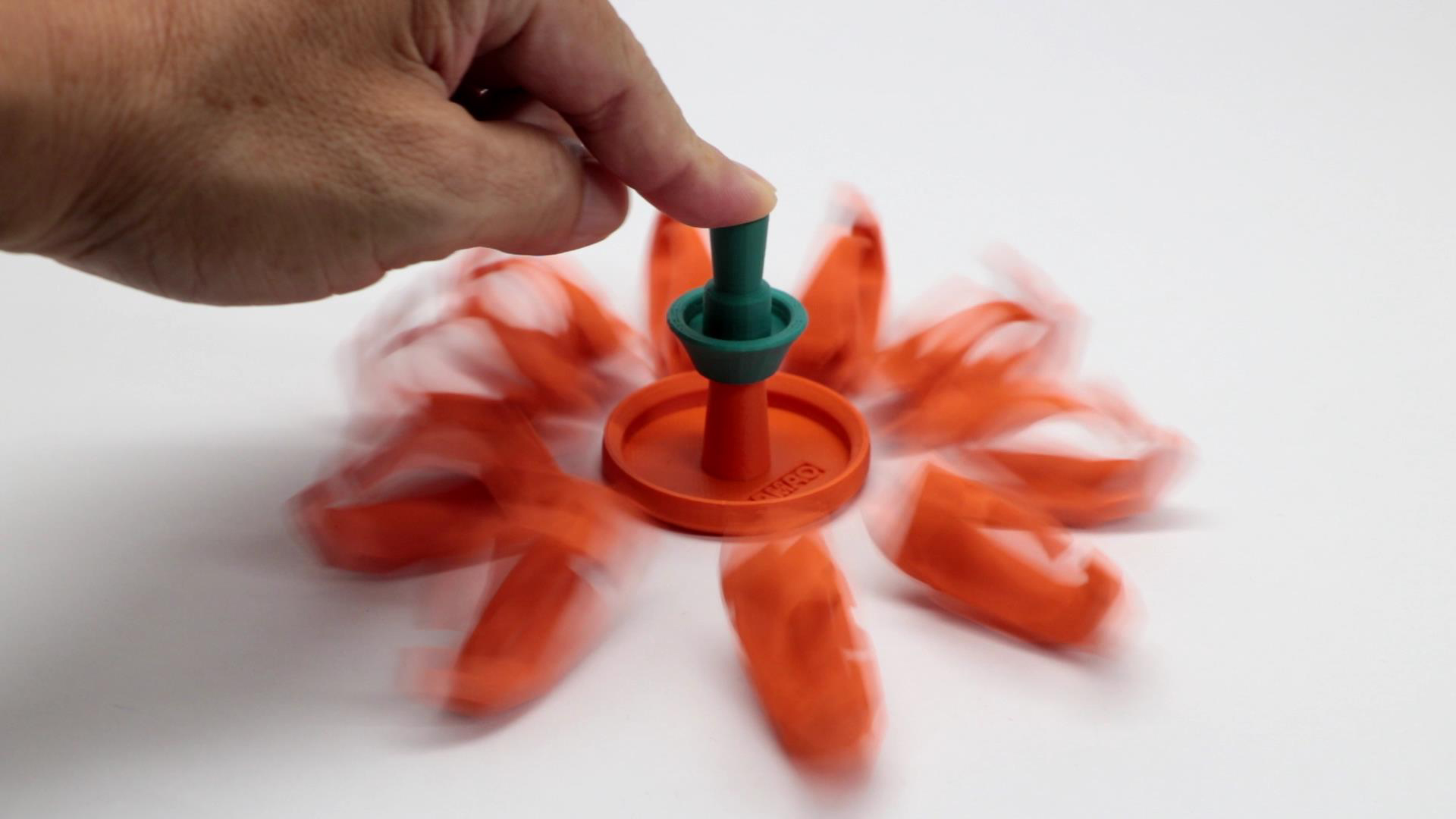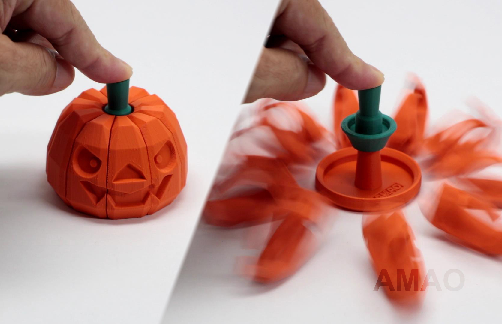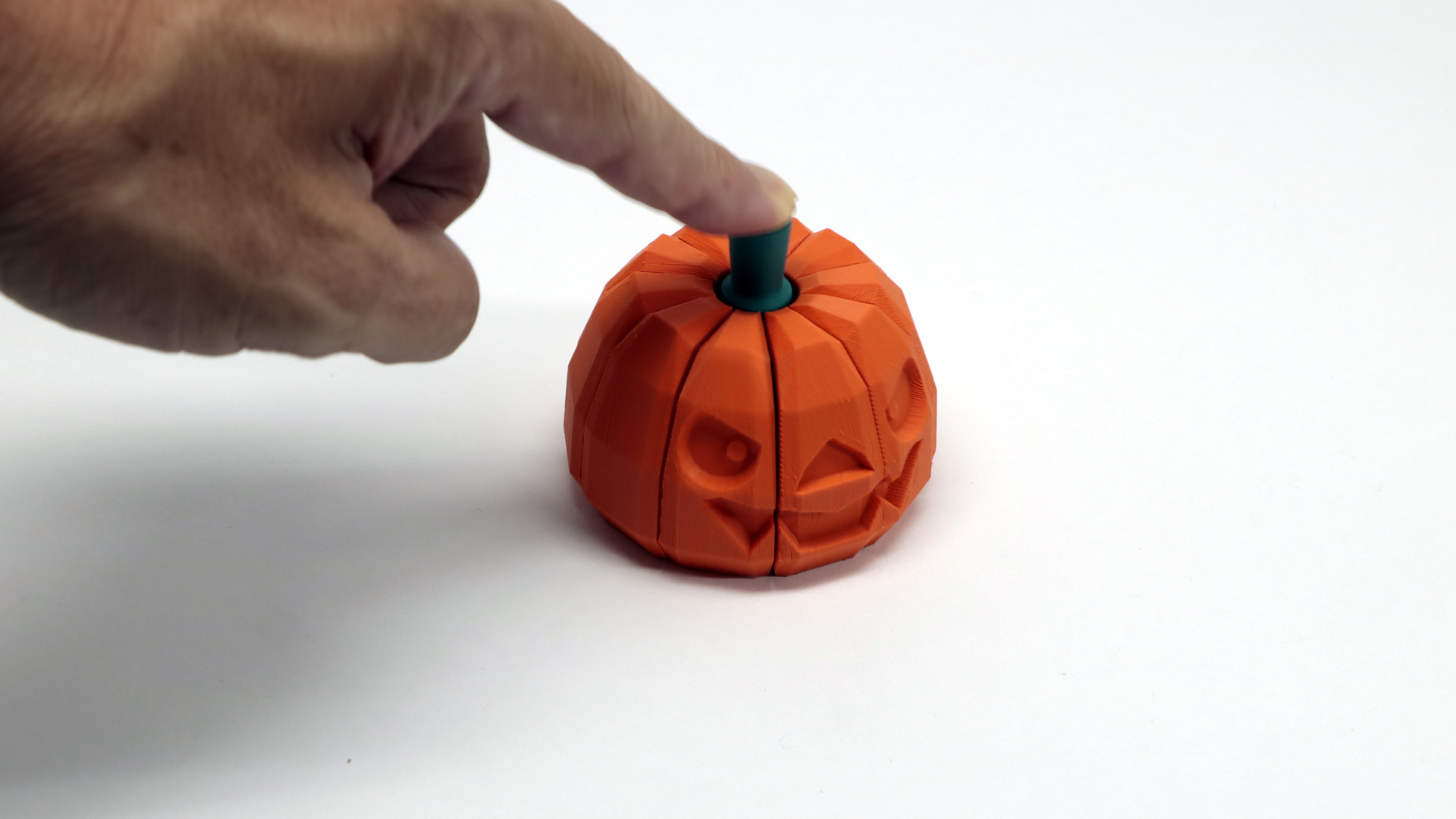 Press the green button on the pumpkin to instantly fry the pumpkin head into pieces, put away the pumpkin pieces, reassemble, and fry again…