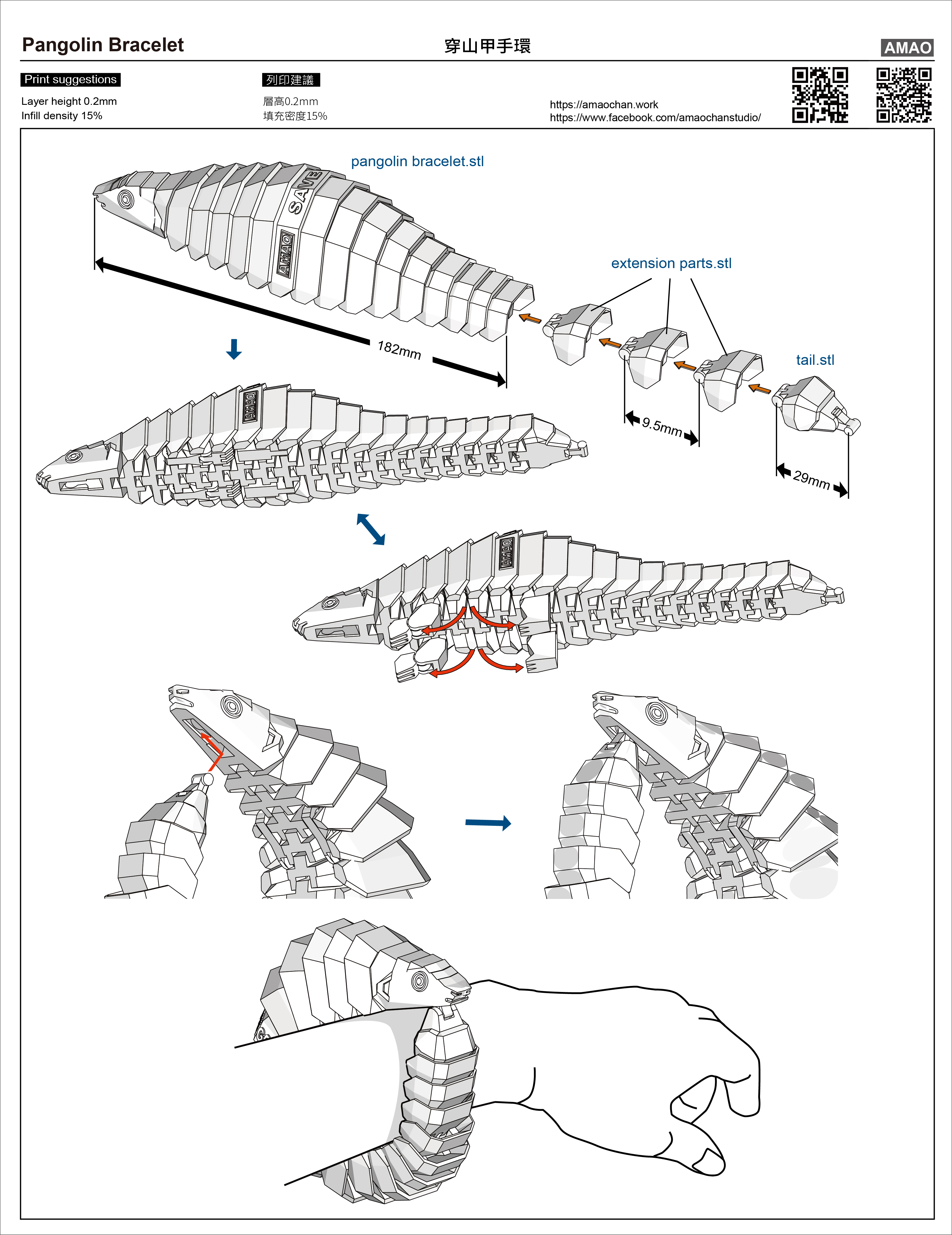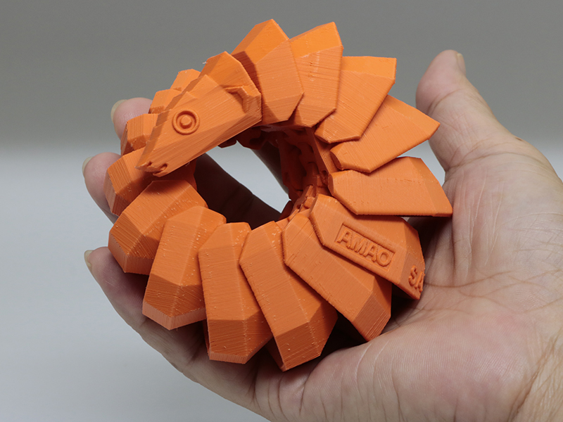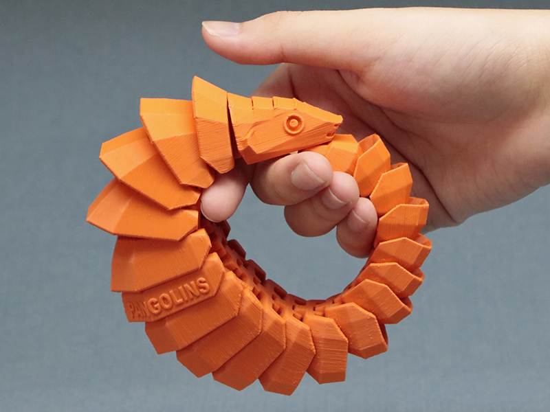 Although “Pangolin Bracelet" and “Save pangolins" are similar in appearance, there are many modifications"Pangolin Bracelet" limbs are designed to be received inside the abdomen, so they can be printed in one piece. Turn the limbs out from the abdomen only when complete. The pangolin bracelet can be extended to match the thickness of the wrist. When the pangolin’s head and tail are connected, it becomes a bracelet on the wrist. It can also be used as a decoration without hanging on the hand.