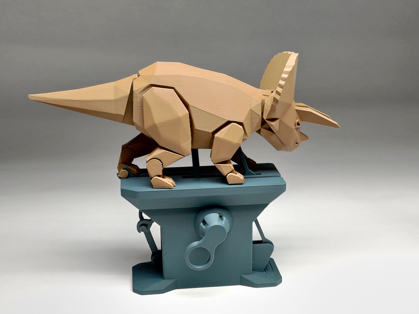 When you turn the handle, the Triceratops opens its mouth and lunges forward. Many joints in its body can rotate, including the head, jaw, front feet, hind feet, knees, and tail. The body also moves back and forth. This Triceratops poses for a confrontation with a Tyrannosaurus.