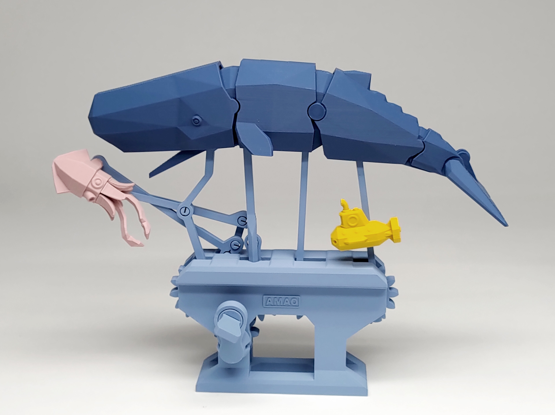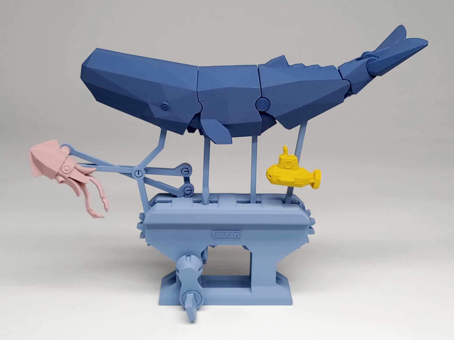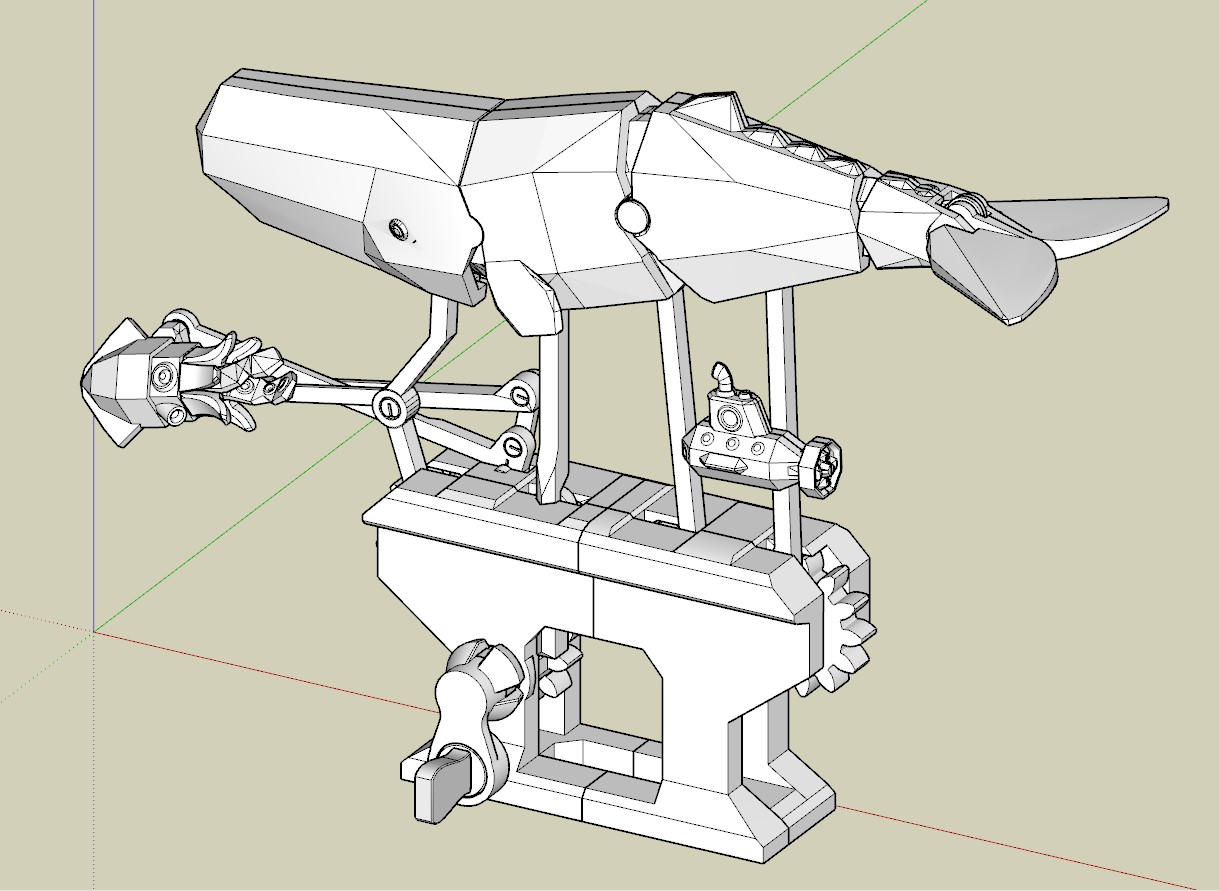 The sperm whale is a huge and elegant beast. Its swimming movements in the sea are full of power and beauty. I like the way it swims differently from fish, so I spent a month designing an automata for the sperm whale to imitate. Sperm whale swimming posture.
