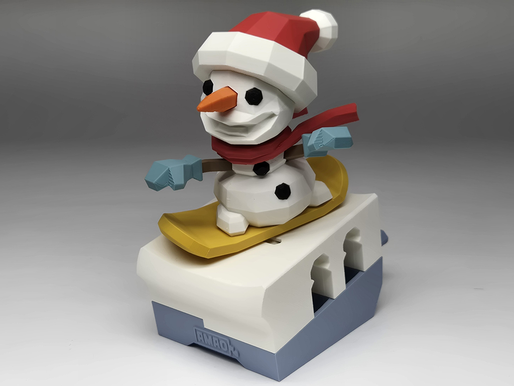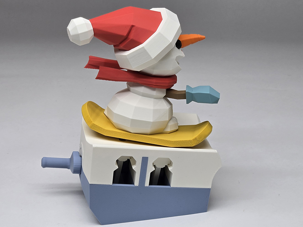 Set in a festive Christmas winter scene, this snowman automata toy is operated by turning a hand crank. As the handle rotates, the snowman slides left and right on its board, recreating the feeling of carving back and forth down a snowy slope. The curved ground on both sides of the base introduces gentle rises and falls, making each turn feel more lively and dynamic. A red hat and scarf echo classic Christmas imagery, adding warmth and holiday charm to the interaction. More than a seasonal decoration, it is a kinetic Christmas toy that invites hands-on play and delivers joy through motion.