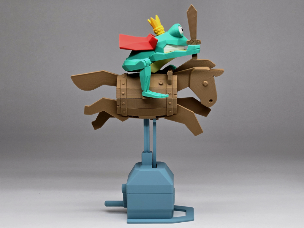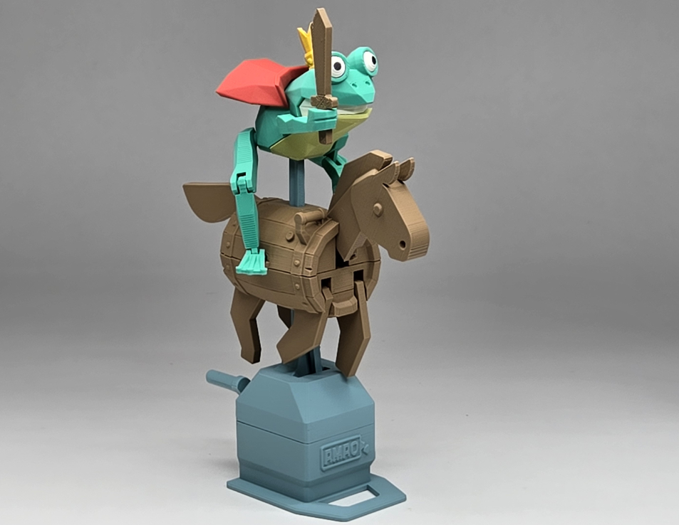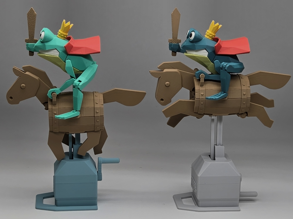 The horse leaps when rotating the handle, while the frog remains stable and unwavering.